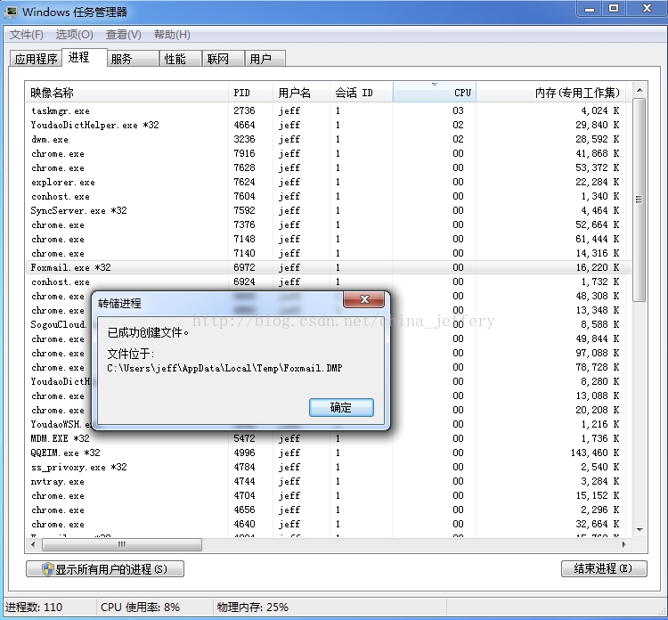 生成方法:右键进程 –> 创建转储文件–>弹出对话框提示生成成功,以及 dmp 文件位置。