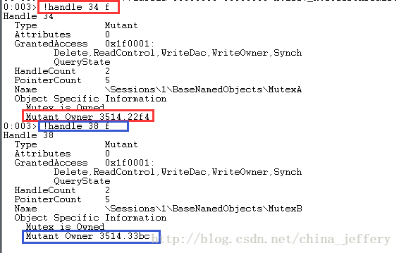 句柄 00000038 为名为 MutexB 的互斥体,被线程 ID:33bc 拥有。