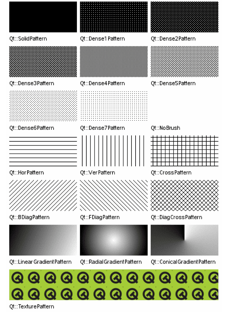 QBrush 有样式(Style)、颜色(Color)、渐变色(Gradient)、纹理图片(Texture)等属性。