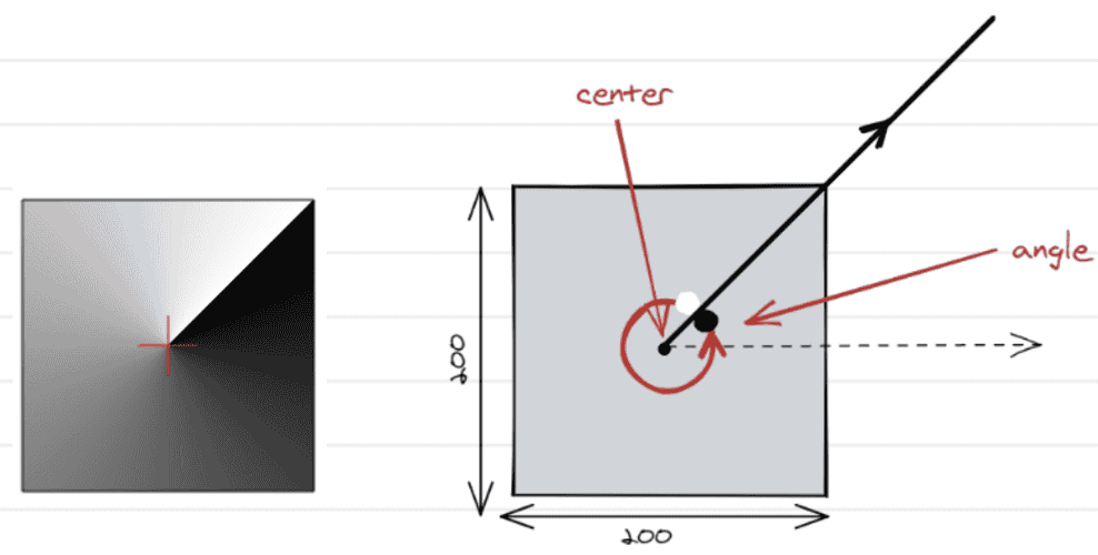 锥向渐变通过中心点(center)和起始角度来(angle)来所连接的直线确定填充的初始方向,然后从该直线开始逆时针进行360度填充,而且每个角度的颜色都是无限向外传播的。