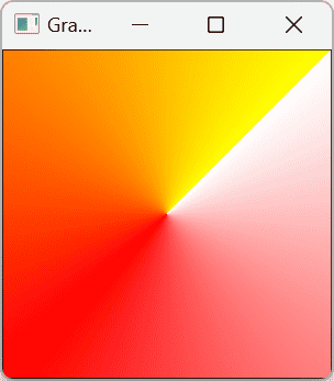 从上图可以看到,渐变色在垂直于渐变线段(中间矩形的左上角和右下角连成的斜线)方向无限扩展,但为什么在渐变范围边界以外还有颜色呢?如左上角的黄色和右下角的白色,这个与渐变的另一个属性特性有关 – 渐变传播,后面章节有详细介绍。