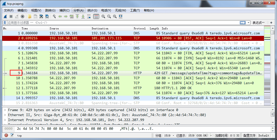 - 箭头上方标出了该 TCP 包