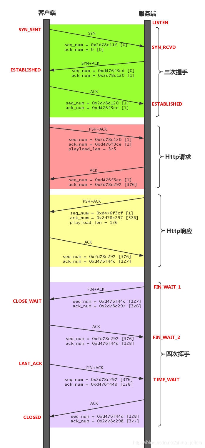 上图是使用 wireshark 抓取的一个 Http 接口请求的过程(不含 DNS 解析等步骤),包含了 TCP 连接建立、Http 请求、Http 响应、TCP 连接断开。现在以这个示例为基础,来画出该 Http 接口请求中涉及的整个 TCP 会话的流程(也是本文最重要的图):