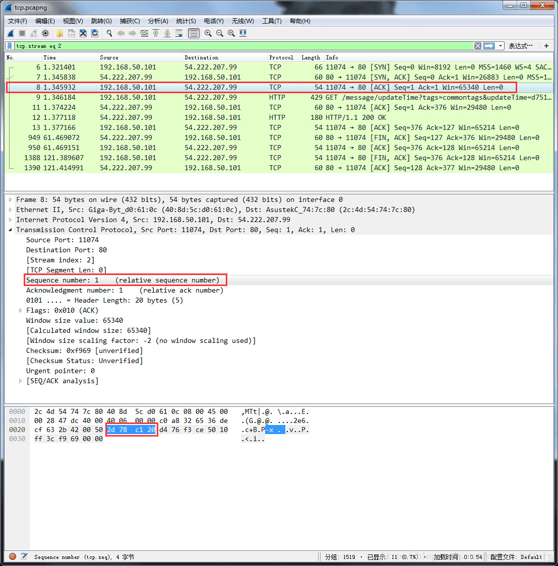 相对序号是 Wireshark 引出的概念,TCP 协议中没有这个概念。Wireshark 使用相对数值来显示序号和确认序号,这个相对值是相对于初始序号(ISN)而言的。因为人类更加习惯跟踪更小数值,所以 Wireshark 默认用相对数值来展示。如果需要查看真实的序号,可以在 wireshark 中选中该网络包,在最下方的数据窗口查看,如: