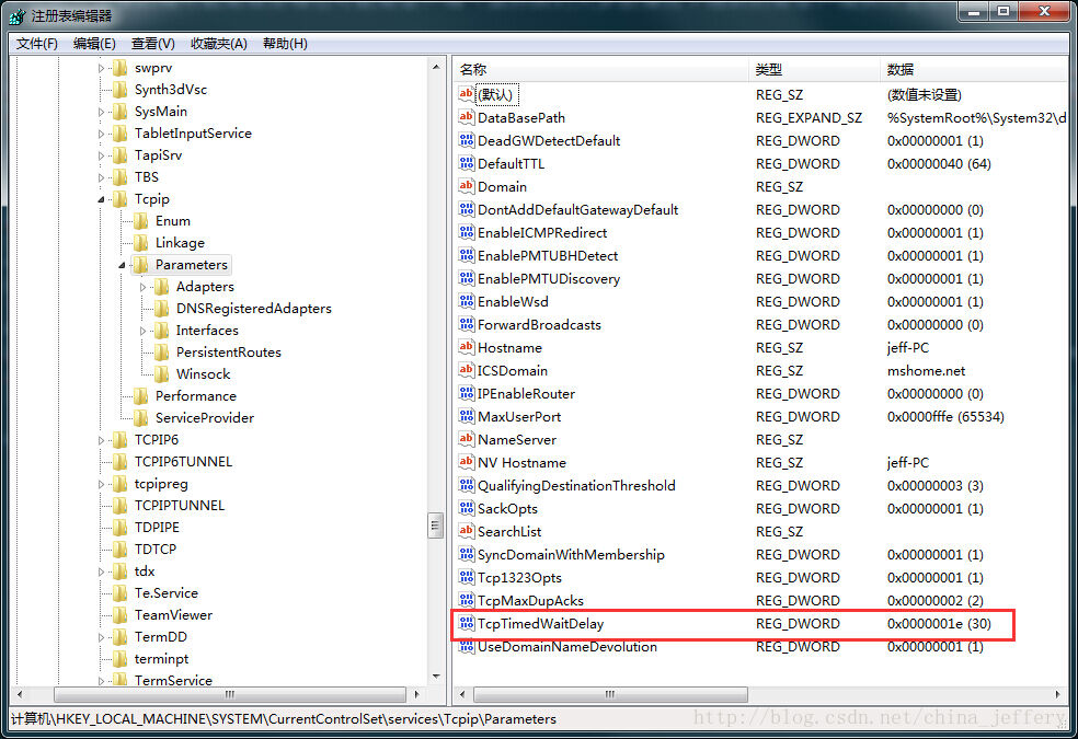 注册表HKEY_LOCAL_MACHINE\SYSTEM\CurrentControlSet\Services\Tcpip\Parameters下的TcpTimedWaitDelay键(如果没有可以新建一个)就对应了2*MSL(2 倍的 MSL)的值。