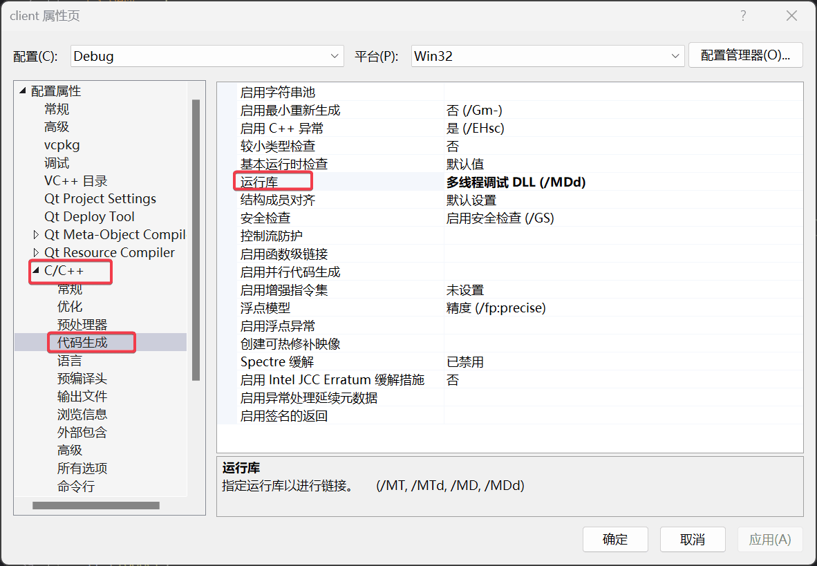 MSVC 的运行库有 MD / MDd 和 MT / MTd 之分,下图是 Visual Studio 中设置运行库的界面。