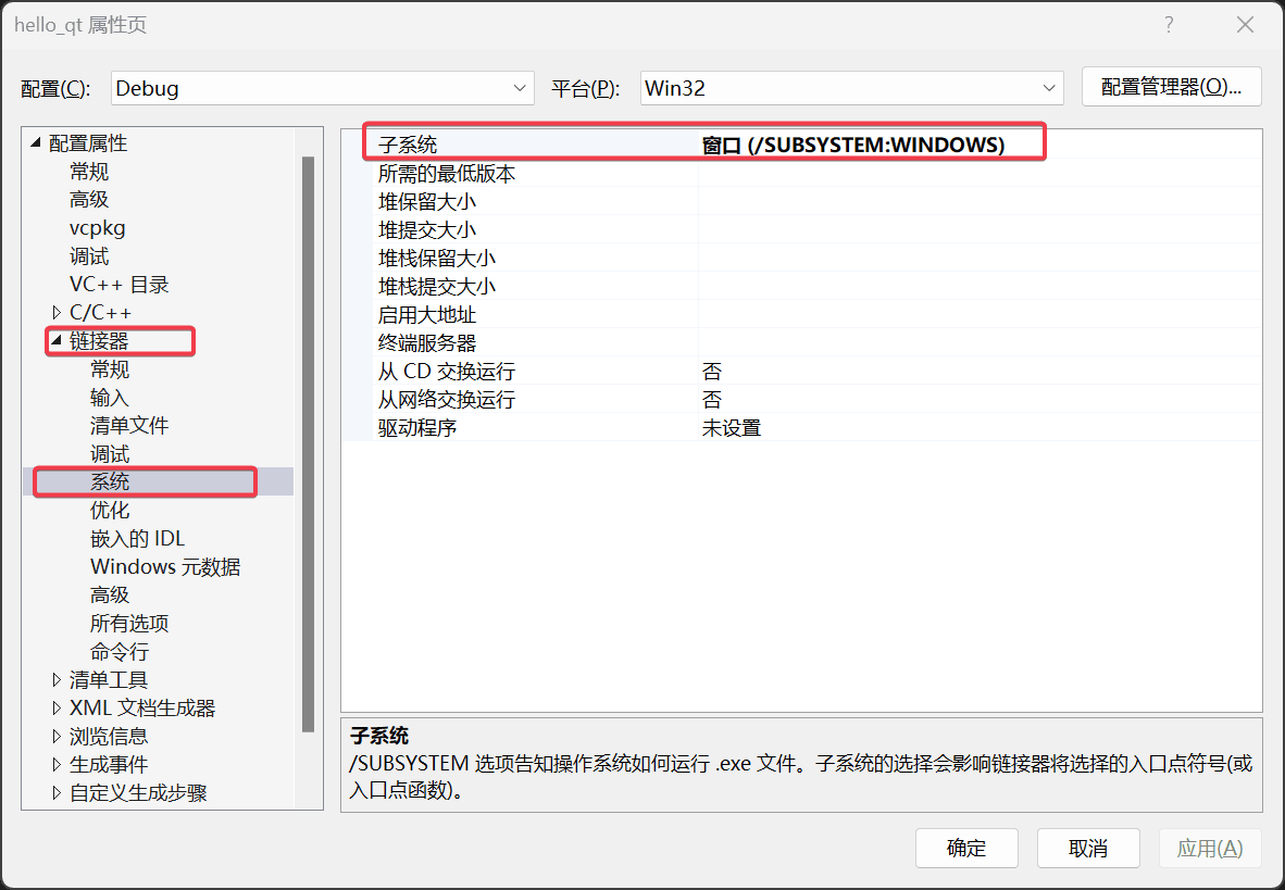 设置 WIN32_EXECUTABLE 属性是为了让链接器使用 /SUBSYSTEM:WINDOWS 子系统,如下图所示: