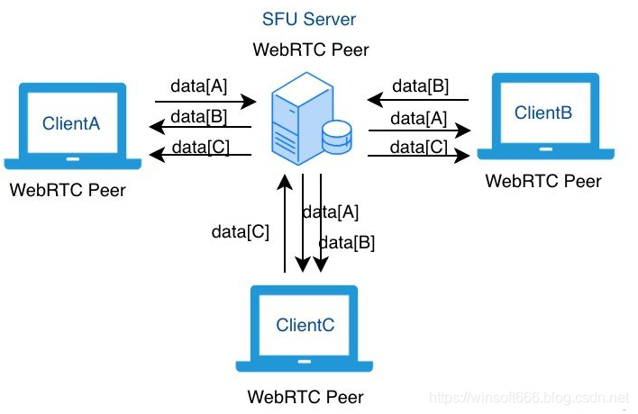 SFU 架构最核心的特点是把自己 “伪装” 成了一个 WebRTC 的客户端,WebRTC 的其他客户端其实并不知道自己通过 P2P 连接过去的是一台真实的客户端还是一台服务器,我们通常把这种连接称之为 P2S,即:Peer to Server。除了 “伪装” 成一个 WebRTC 的客户端外,SFU 服务器还有一个最重要的能力就是具备one-to-many的能力,即可以将一个客户端的数据转发到其他多个客户端。