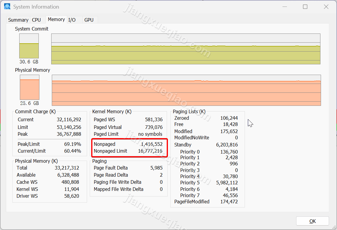 对于 x64 系统,非分页内存池的大小一般为物理内存的 75%,我们可以使用 Process Explorer 查看(View -> System Information)当前系统实际的非分页内存信息: