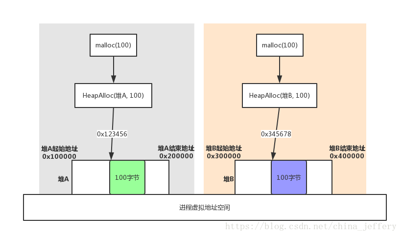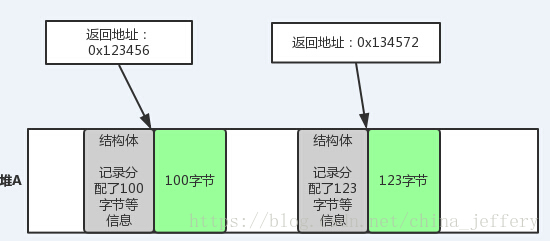 如上图,通过malloc函数从“堆 A”中分配 100 字节内存块,内存块地址为0x123456;从“堆 B”中分配 100 字节内存块,内存块地址为0x345678.