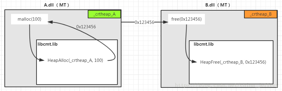 现在有 2 个模块(A.dll和B.dll)都是使用MT运行时库,即加载的静态库libcmt.lib(可以参考理解 Visual C/C++ 运行时库),在A.dll中使用malloc分配 100 字节的内存,malloc返回的内存地址为0x123456。然后将该地址传给B.dll,在B.dll中调用free函数来释放这个内存。如图: