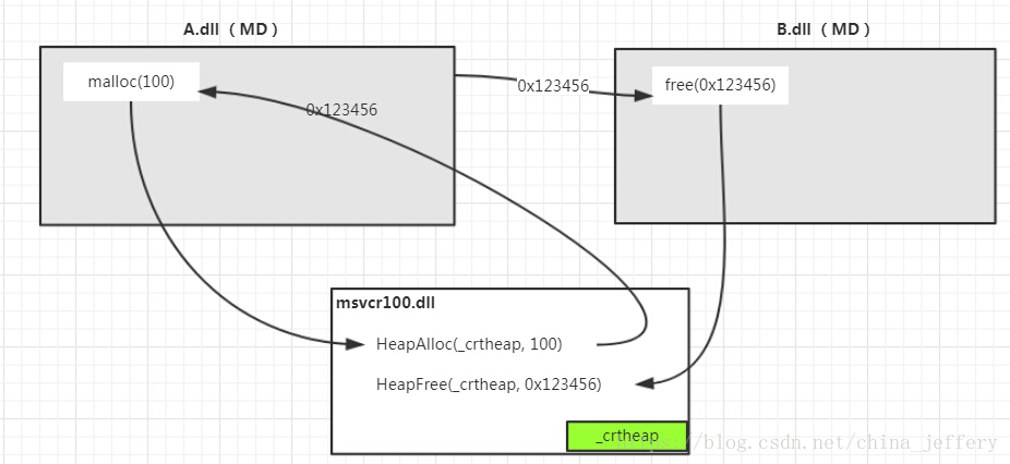 还是 2 个模块(A.dll和B.dll),但是现在他们都是使用MD运行时库,即加载的动态库msvcr100.dll,程序的代码的过程和上面一样,还是在A.dll中使用malloc分配 100 字节的内存,malloc返回的内存地址为0x123456。然后将该地址传给B.dll,在B.dll中调用free函数来释放这个内存。但是这个时候程序却不会崩溃,通过下面的图我们基本可以明白原因了,如图: