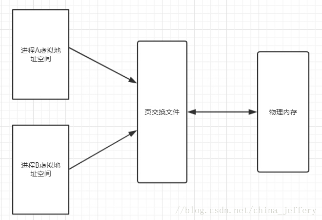 虚拟地址空间、页交换文件、物理内存三者的关系如下图: