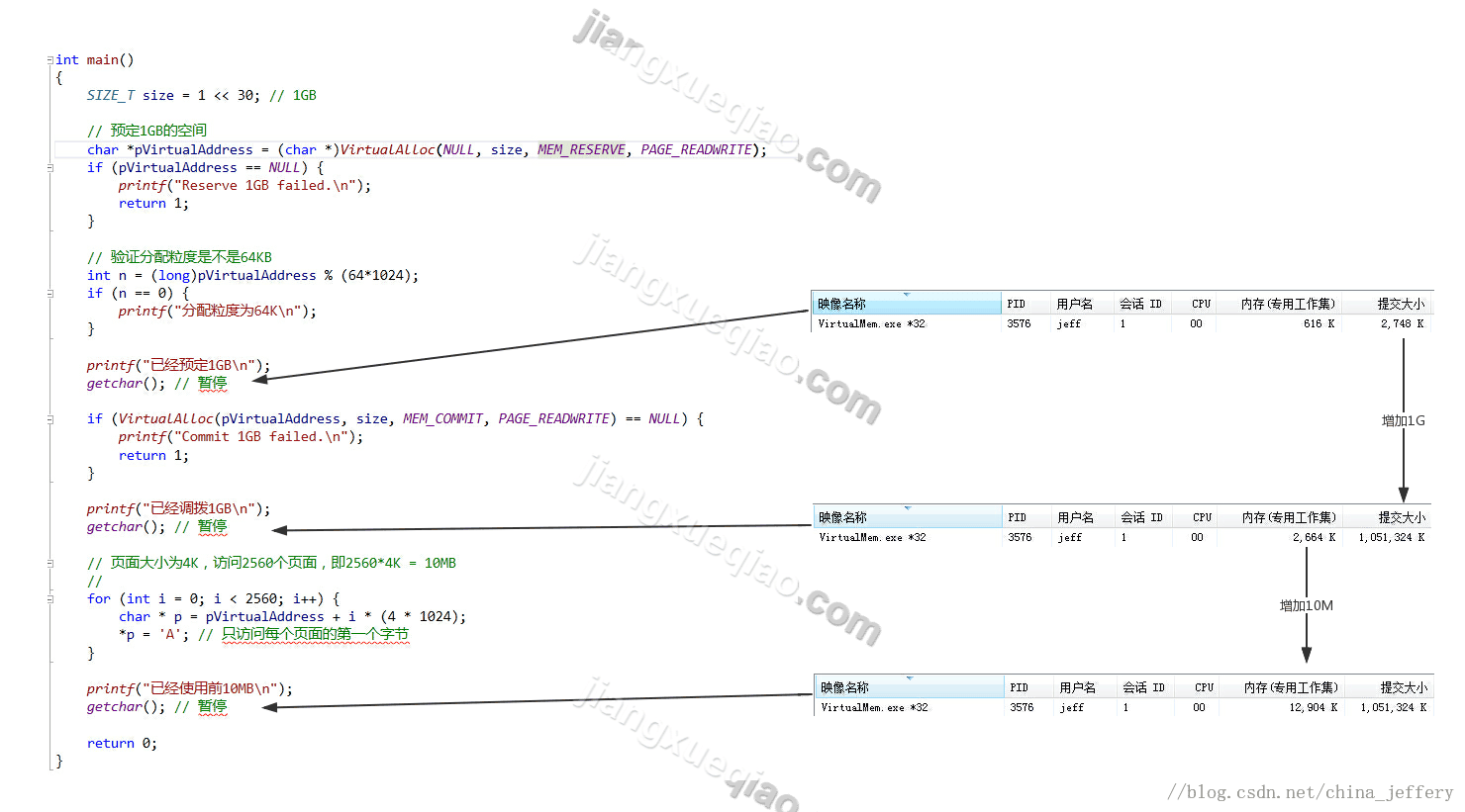 在程序运行各个阶段进程的内存情况如下图:(“内存专用工作集”表示占用的物理内存的大小,“提交大小”表示调拨的页交换文件的大小)