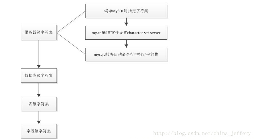 服务器级、数据库级、表级、字段级 这 4 个字符集设置影响到数据库中存储数据的编码。 这 4 个级别的字符集继承关系为:服务器级 --> 数据库级 --> 表级 --> 字段级, 从左到右,一级继承一级,和 C++、Java 中的类的继承类似,如果某一级未显式的指定字符集,那么将继承上一级的字符集设置。