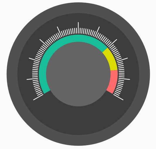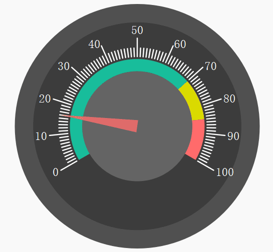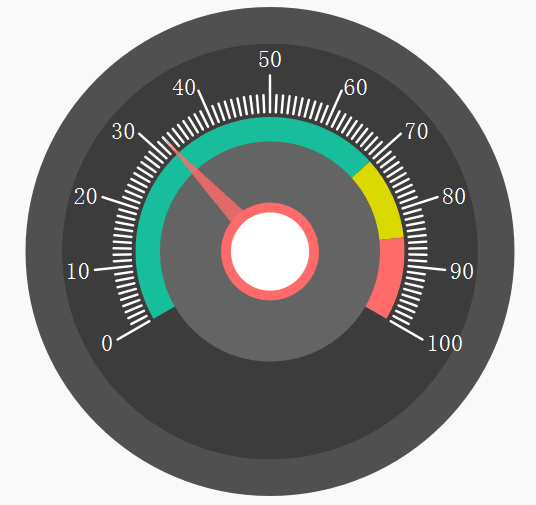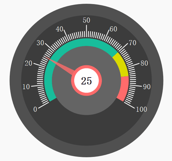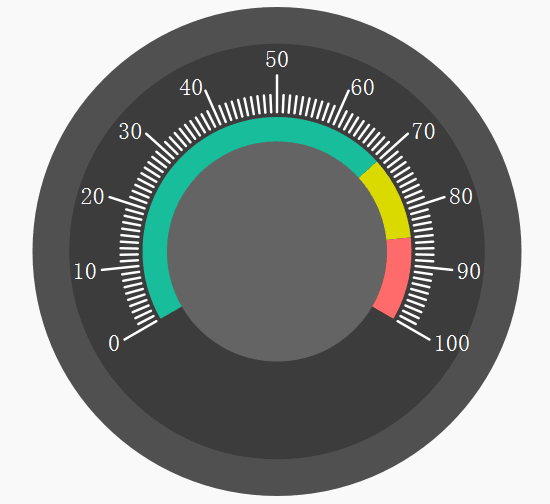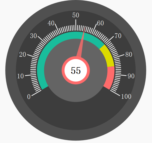 由于仪表板控件是一个通用型的控件,因此在实际应用中,其长宽并不固定为100px,其可以为任意值,为了保持美观和协调性,外圆、内圆、中心圆、数字字体等元素的大小都需要根据控件的大小而动态的改变。我们可以通过百分比的方式来设置各个元素的大小,如: