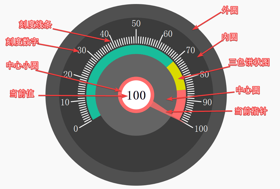 废话不多说,下面开始分布讲解仪表盘的绘制步骤。为了便于后面的描述,我们先将控件上的各个元素进行标注: