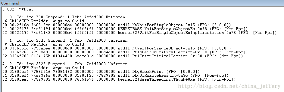 ~*knv3查看各个线程的调用堆栈,数字 3 表示显示的堆栈深度,省略即显示完整堆栈。
