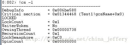 !locks没有显示 LockSemaphore 字段,我们可以通过!cs -l命令获取更为全面的关键区信息:
