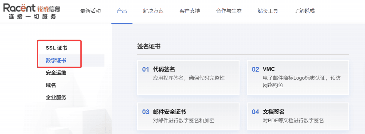 打开任何一个数字证书售卖网站都可以看到它们通常将数字证书分为两个大类:SSL证书和数字签名证书。