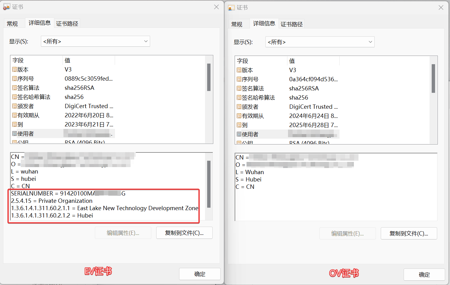 从上图可以看出,EV证书比OV证书多了很多字段。