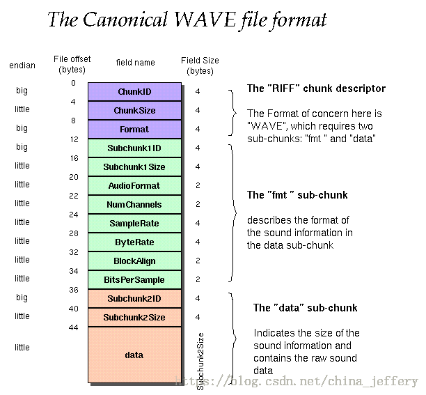 | 32 | 2 | BlockAlign | 每个 Sample 的大小,等于NumChannels * BitsPerSample/8 |
