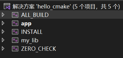 编写完 CMake 脚本以后,就可以使用 CMake GUI 或命令行来生成对应的工程文件了。以 Visual Studio 为例,对于有 my_lib 库 和 app 应用程序的项目,CMake 会生成如下图所示的 5 个项目: