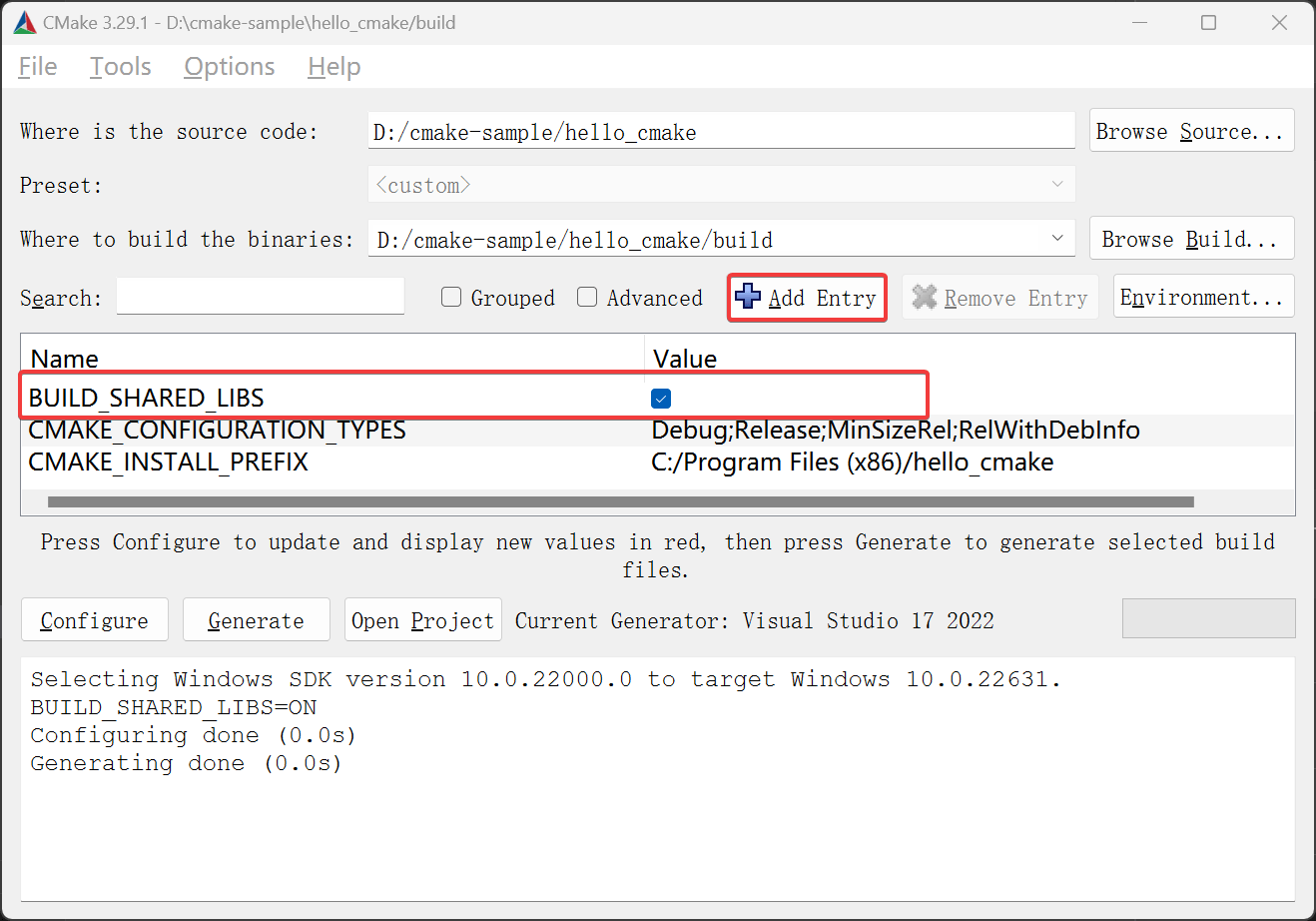 亦可以在 GUI 界面上设置 BUILD_SHARED_LIBS 变量,如: