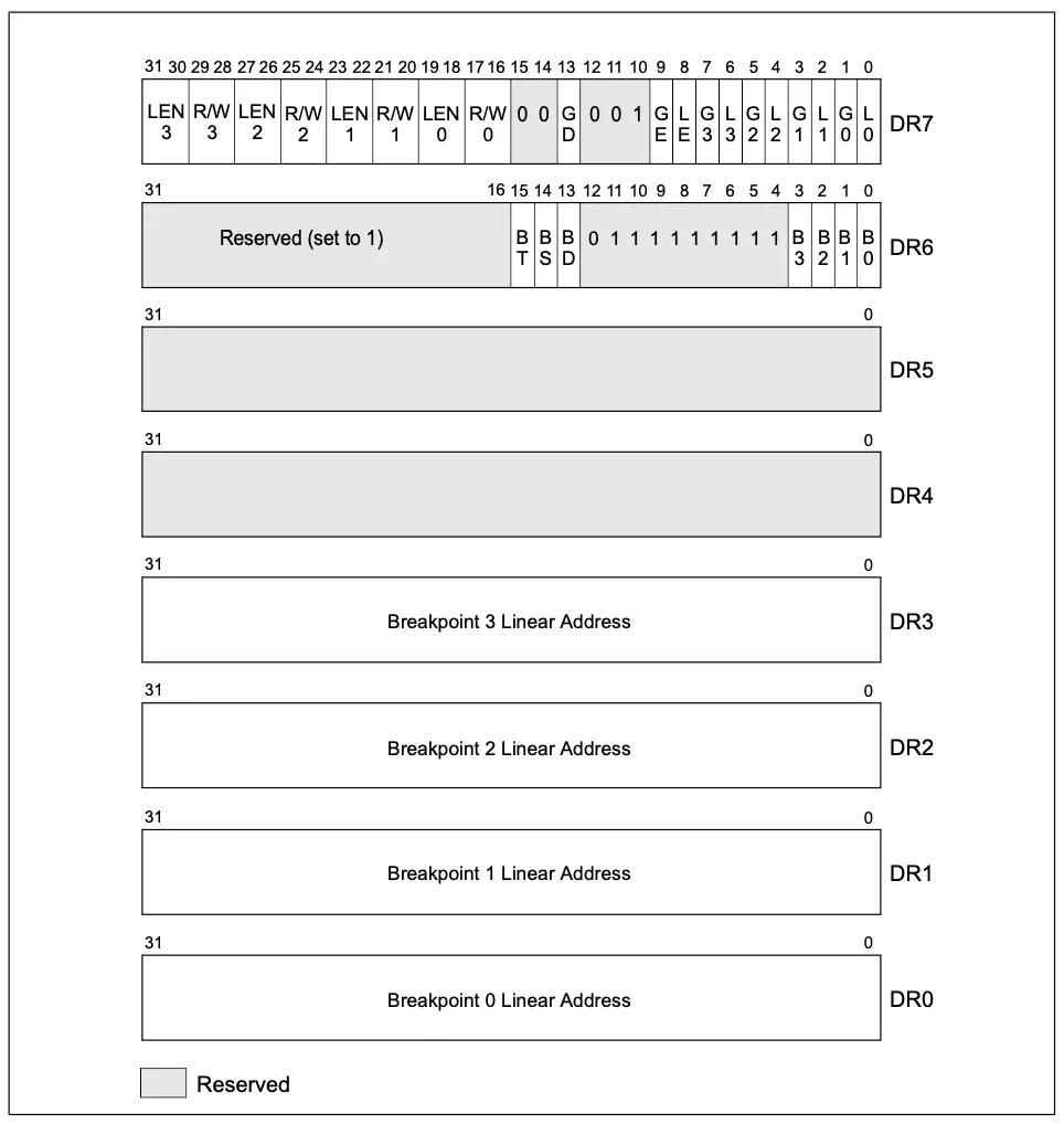 调试寄存器(Debug Registers)用于硬件级调试,支持设置硬件断点、监控内存访问和执行流程。这些寄存器包括DR0 ~ DR7,共 8 个,其中DR0 ~ DR3用于存储断点地址,DR4 ~ DR5保留,DR6 用于记录调试状态,DR7 用于控制调试行为。以下是详细介绍和表格列表。