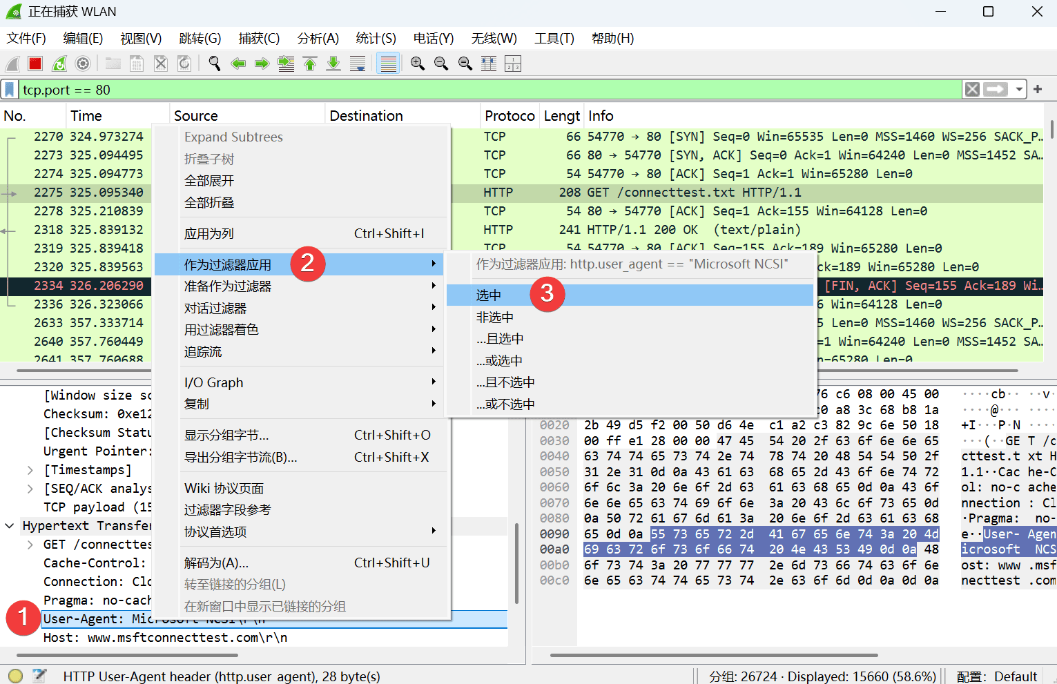 tcp.port == 80,而不能像捕获过滤器那样不管协议,只要是该端口就捕获,如port 80。 - 显示过滤器不能使用