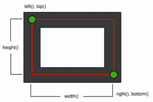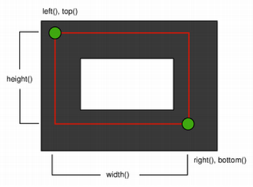 基于上述原因,QRect::right() 和 QRect::bottom() 的值并不等于矩形真正右下角的坐标。