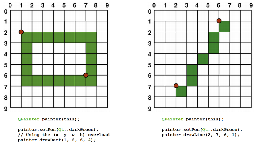 Qt 默认绘图的元素是有锯齿的,当使用 1 像素宽的画笔绘制时,实际像素将渲染到我们定义坐标的右下方,如下图所示: