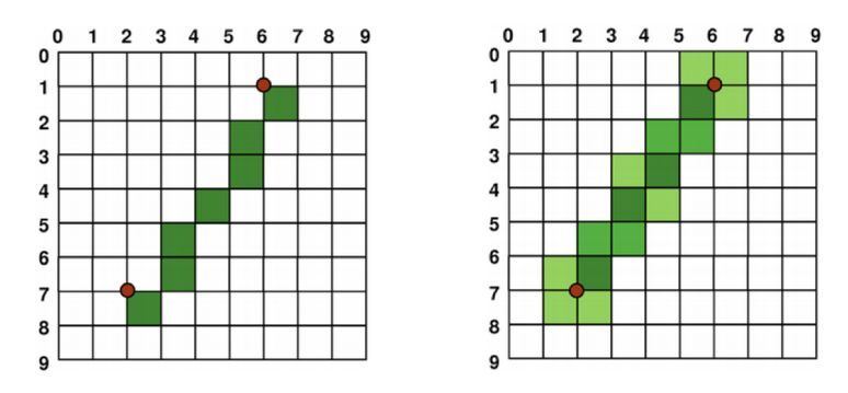 下图展示了在绘制一条斜线时,未开启抗锯齿(左边)和开启了抗锯齿后(右边)两者的效果。